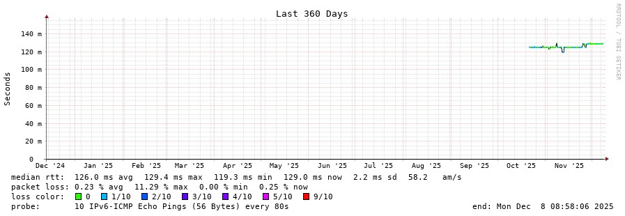 15 > 2001:b68:d:0:ee08:6bff:fe73:2da0 (2001:b68:d:0:ee08:6bff:fe73:2da0) [AS2108] 129.480ms 129.429ms 129.375ms